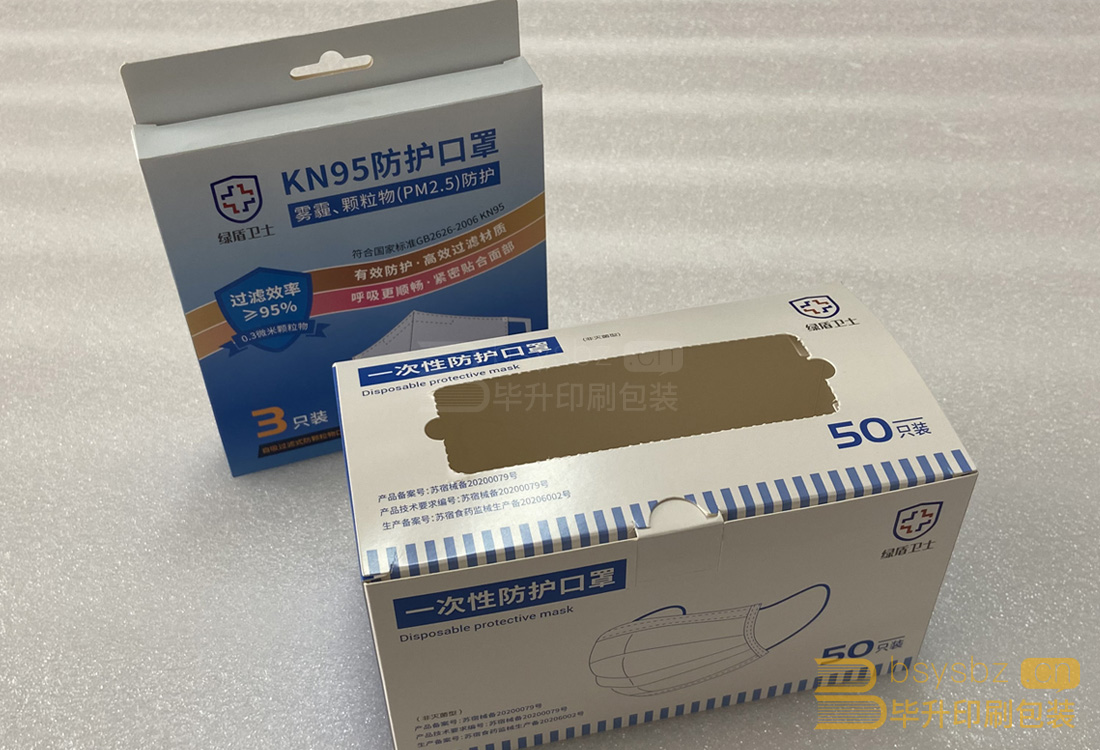 KN95防護(hù)口罩盒使用帶掛鉤鎖底盒的制作方式,采用350g白卡紙四色印刷、裱光膜、模切、糊盒成型。此口罩盒符合國家標(biāo)準(zhǔn)(GB2626-2006 KN95)。南京口罩盒印刷必選畢升印刷包裝有限公司。