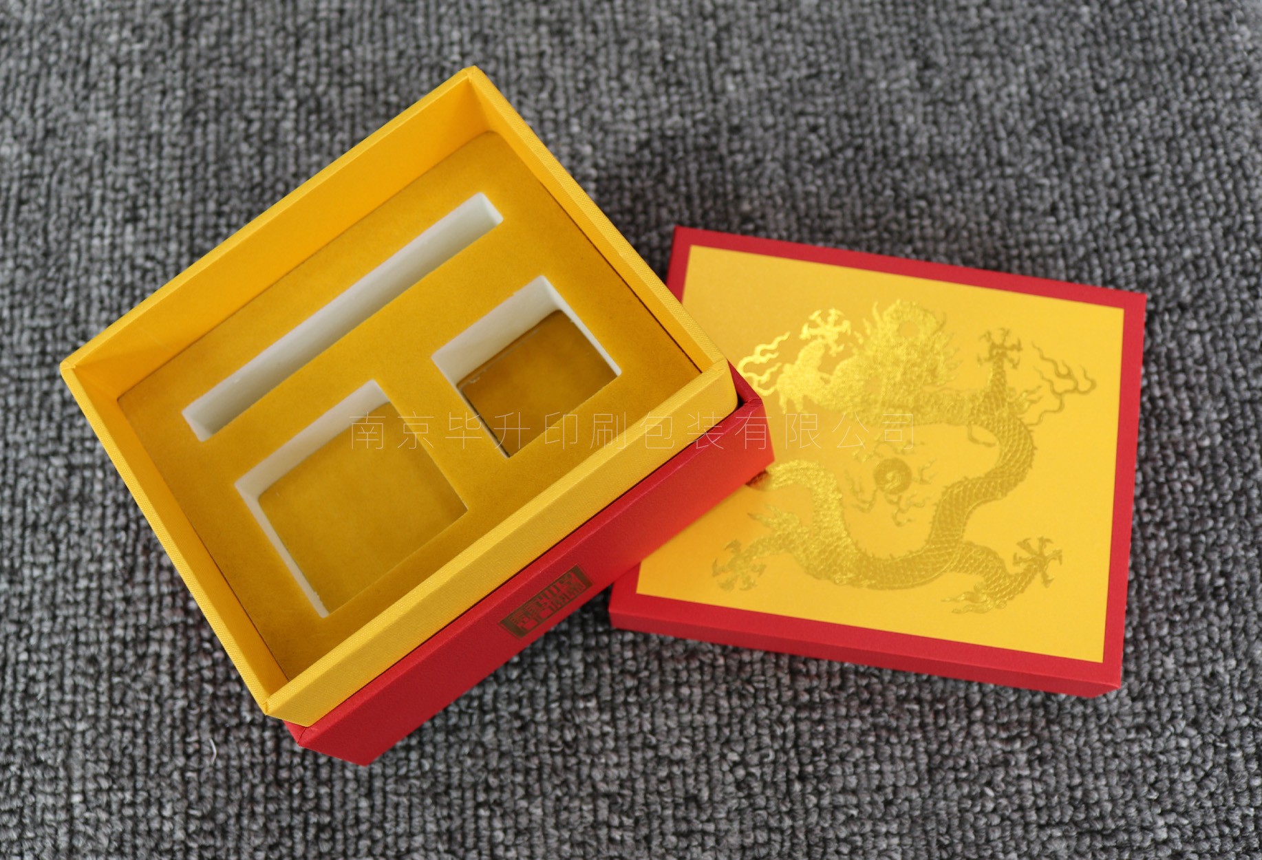 朕的朝代精品禮盒金色絨布配白色EVA內(nèi)襯,裱紙使用特級(jí)藝術(shù)紙壓紋、燙金。越小的禮盒對(duì)制作的水平要求越高,畢升印刷包裝專業(yè)的禮盒供應(yīng)商。