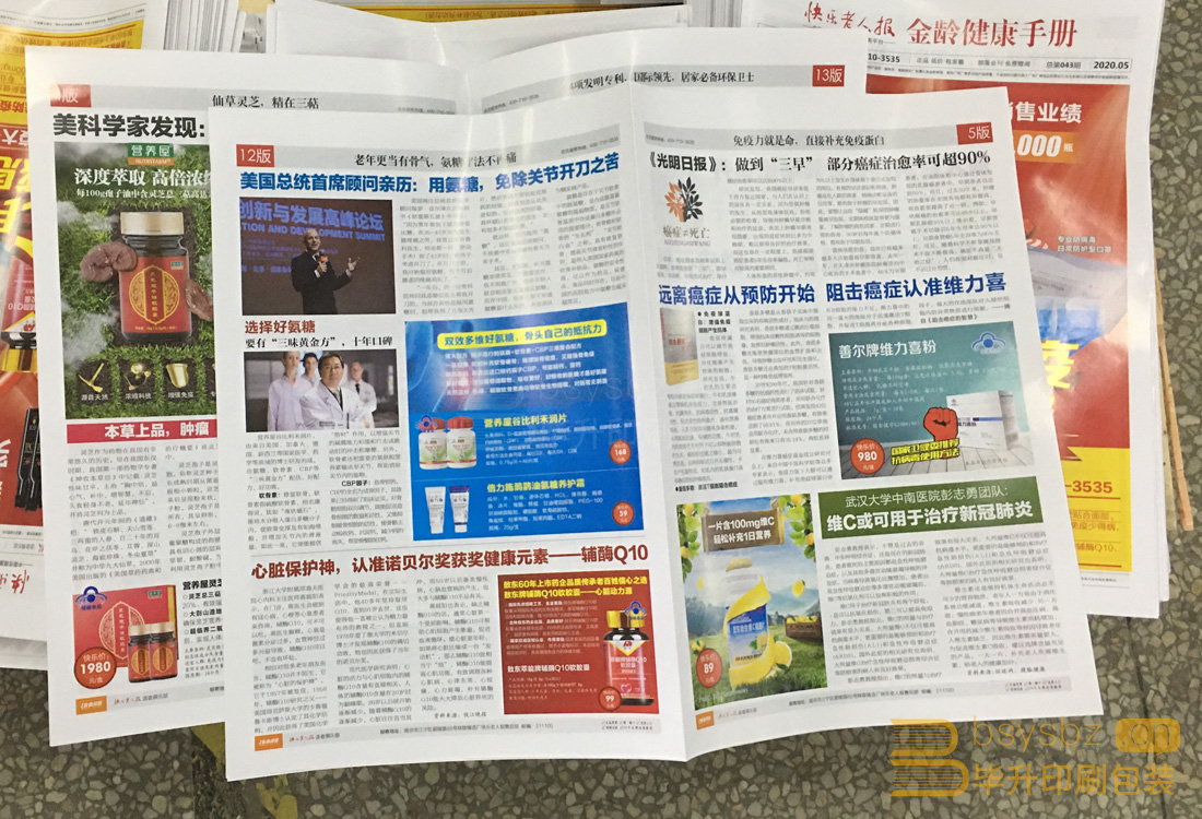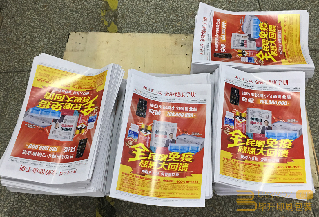 快樂老人報(bào)紙、金陵健康手冊(cè)128g銅版紙對(duì)開上機(jī)印刷,上全自動(dòng)折頁機(jī),對(duì)折再對(duì)折。南京畢升印刷專業(yè)單頁印刷、海報(bào)印刷、折頁印刷,價(jià)格實(shí)惠、質(zhì)量好;專業(yè)的人做專業(yè)的事,全心全意問您服務(wù)。
