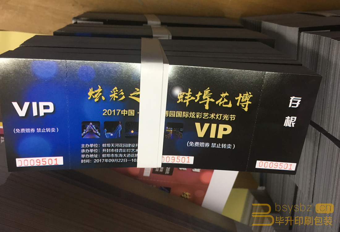 炫彩之夜、蚌埠花博會門票由南京畢升印刷定制發(fā)行,門票采用200g銅版紙四色印刷、過光油、壓齒線、打流水碼。每張券3個碼,分別為銷售方存根、主票客戶留作紀(jì)念、副票由檢票部門存根。這樣的好處是比較方便同意管理,客戶在副票上填寫自己的聯(lián)系方便方便活動抽獎使用,既增加了互動性,又能獲取優(yōu)質(zhì)客戶信息。因?yàn)槊恳粋€號碼都制定特定銷售部門可以輕松查詢到每一個銷售部門銷售的實(shí)際情況。