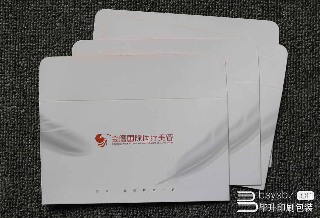 紙張使用170g凝柔彩域 超白 正度(南京冠美紙業(yè))普通信封正常都采用單面印刷,信封的內(nèi)部是不印刷的。而且南京印刷廠推薦金鷹國際醫(yī)療美容信封采用雙面海德堡精印的方式,既確保了色彩的飽和度又提高了信封的品質(zhì)。