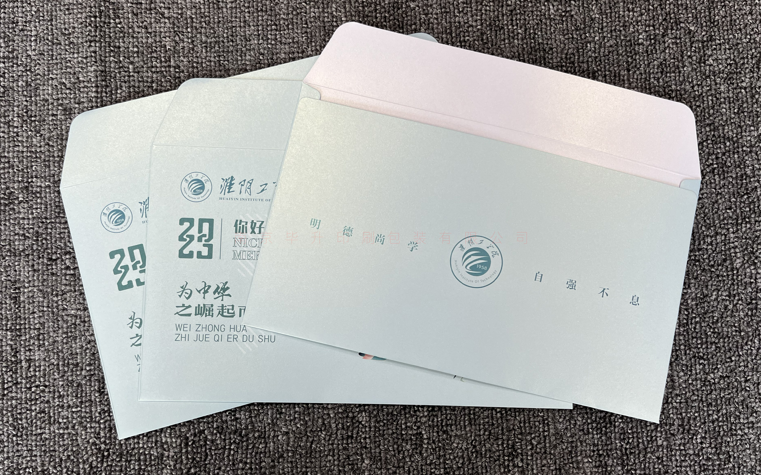 淮陰工學院是一所位于中國江蘇省淮安市的本科工科院校。該校2023年錄取通知書采用了異形模切、封套和 300 克珠光紙等材料制作,并使用了西式信封,上印有“為中華之崛起而讀書”的口號。這份錄取通知書的設計既體現了學校的特色,也表達了對新生的期望。異形模切和珠光紙的使用使得錄取通知書更具質感和獨特性,而西式信封和口號則展現了學校的文化底蘊和愛國情懷。淮陰工學院希望精心設計的錄取通知書,體現了對新生的尊