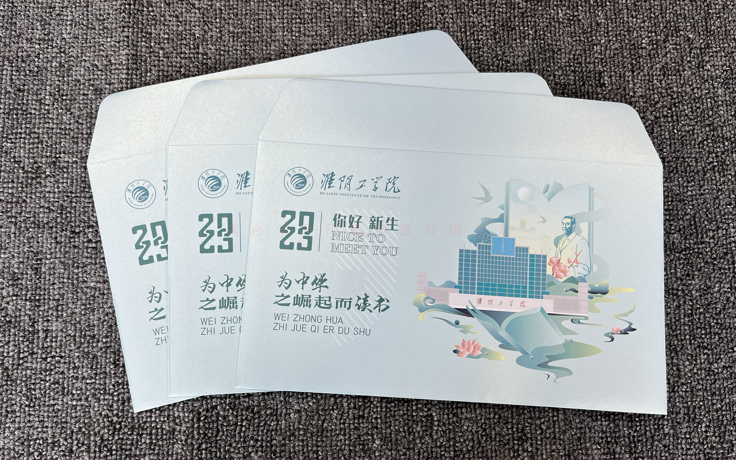 淮陰工學院是一所位于中國江蘇省淮安市的本科工科院校。該校2023年錄取通知書采用了異形模切、封套和 300 克珠光紙等材料制作,并使用了西式信封,上印有“為中華之崛起而讀書”的口號。
