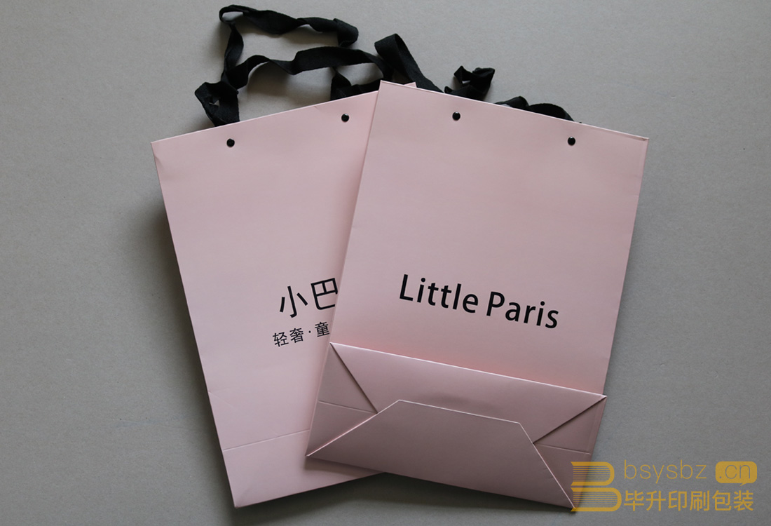 小巴黎手提袋采用300g白卡紙四色印刷、覆啞膜、訂氣眼加黑色布繩,盡顯產(chǎn)品的不同路線和高端風(fēng)格。