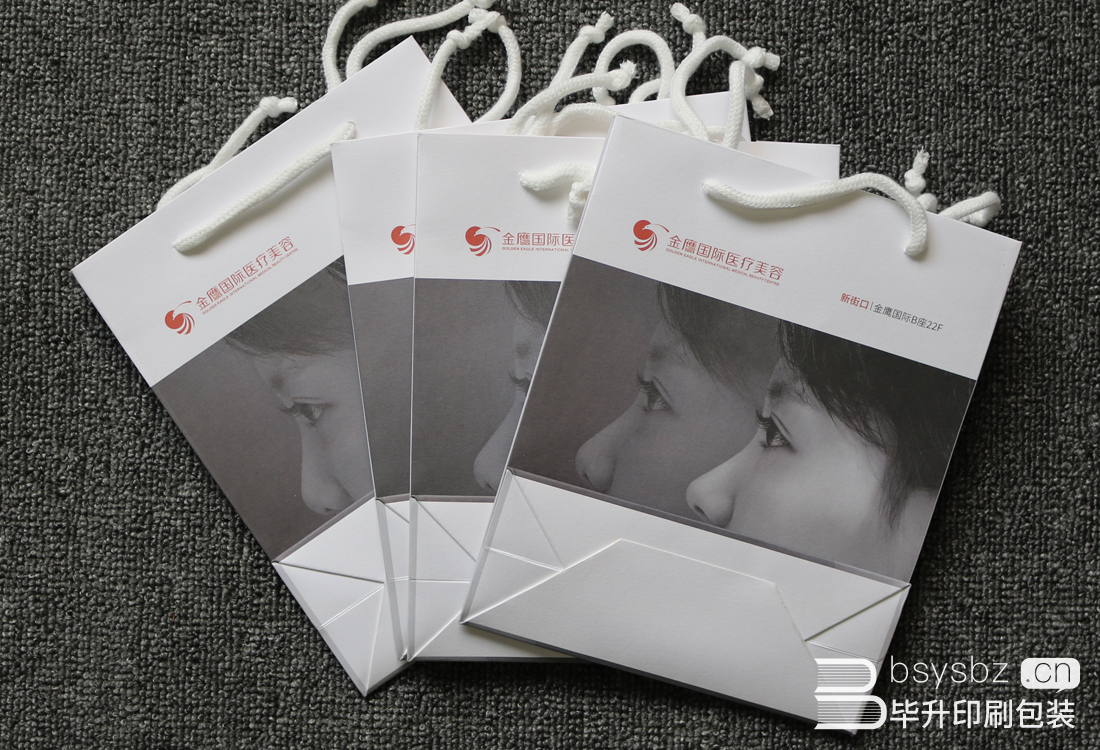 南京金鷹國際醫(yī)療美容手提袋紙張使用南京冠美紙業(yè)提供的260g新柔風尚(超白)、繩子使用普通棉繩打結(jié)火燙的方式,讓普通的棉繩變的不普通。為了確保產(chǎn)品的高質(zhì)量南京印刷廠建議客戶增加工藝,增加袋口的強度在包口內(nèi)貼糊300g白卡襯紙確保手提袋強度。盡管這樣的手提袋客戶主要用來裝化妝品,不會裝比較重的東西。