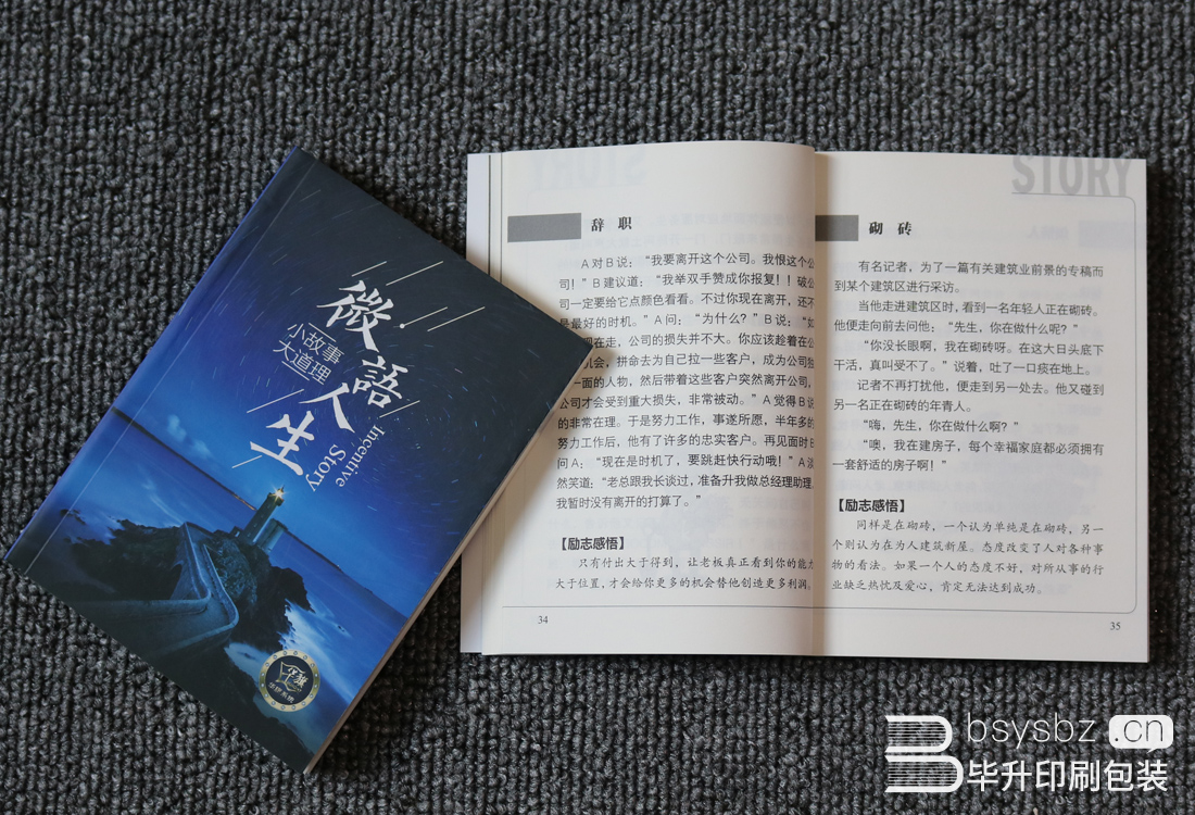安然花旗微語人生、小故事大道理、心靈雞湯手冊(cè),由南京印刷廠設(shè)計(jì)、印刷。封面設(shè)計(jì)簡(jiǎn)潔大方,大海、遠(yuǎn)方、星空、燈塔預(yù)示為財(cái)富導(dǎo)航,為人生導(dǎo)航而詮釋全書,內(nèi)文采用小故事的形式加上勵(lì)志感悟,通俗易懂,更適合新員工閱讀。全書為2本,共計(jì)印刷了15000套。采用大度32開的規(guī)格,方便員工隨身攜帶。
