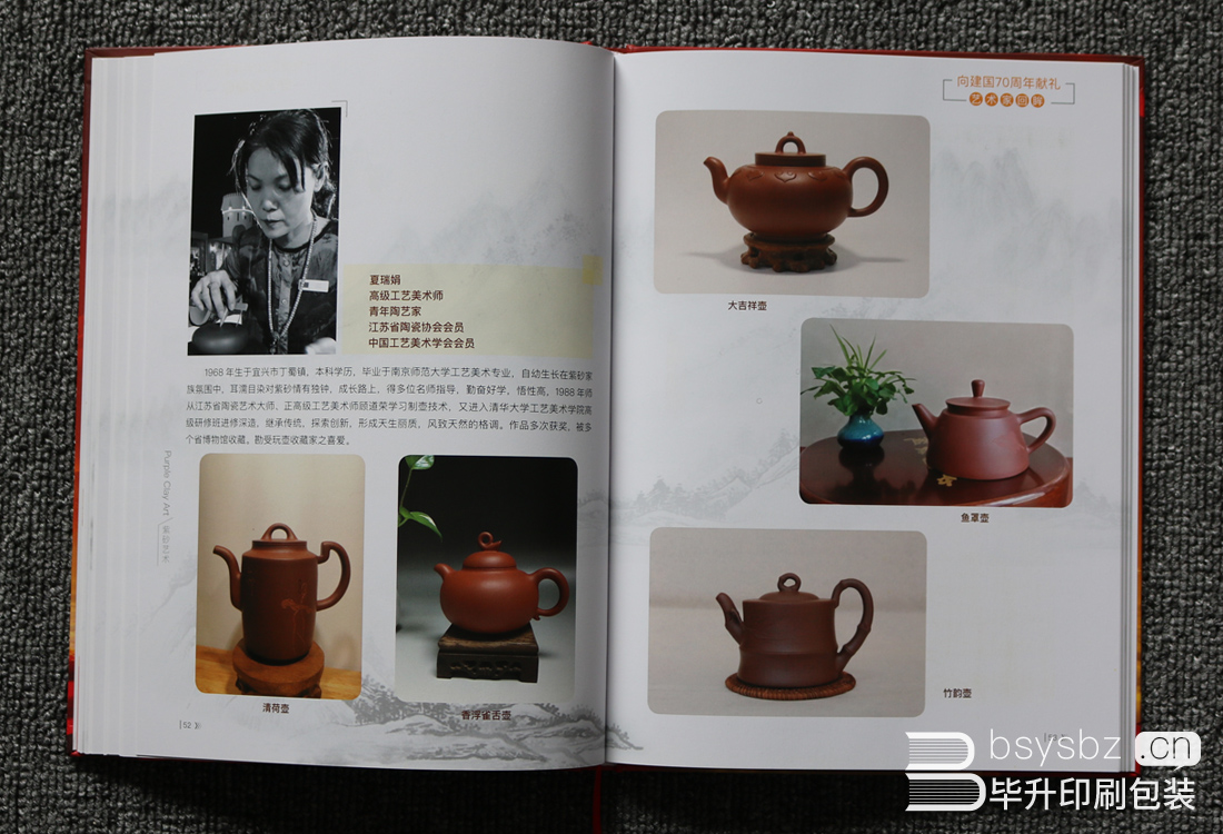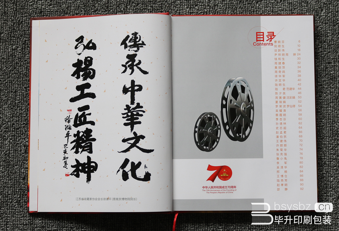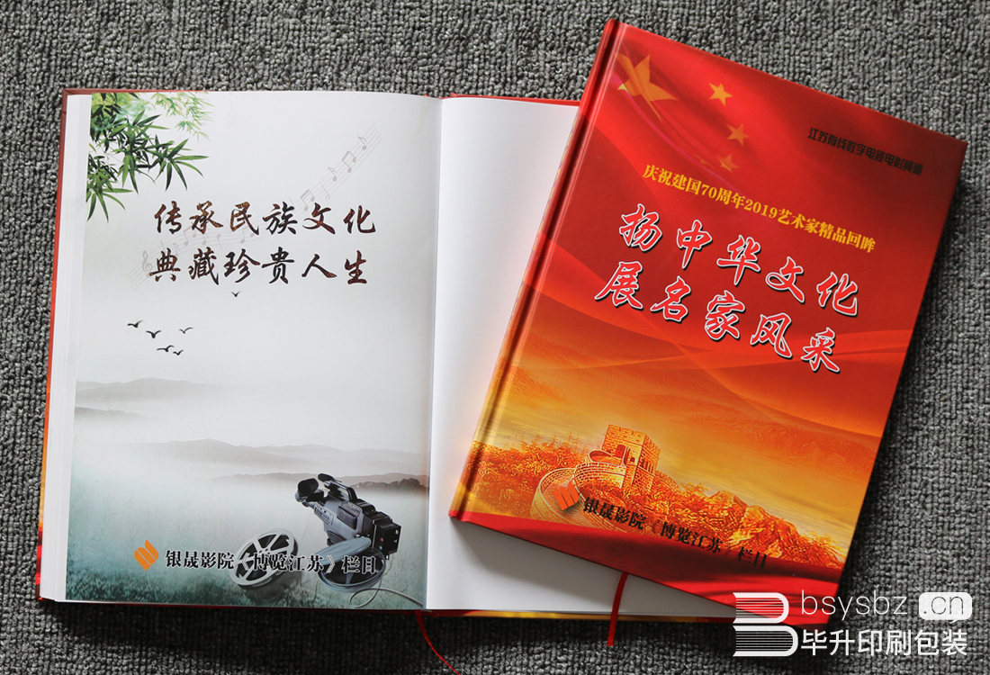 江蘇有線數(shù)字電影頻道為慶祝建國(guó)70周年特舉辦2019藝術(shù)家精品回眸,揚(yáng)中華文化,展名家風(fēng)采。全冊(cè)使用太空梭無光銅版紙精印,精裝。由江蘇省收藏家協(xié)會(huì)會(huì)長(zhǎng):徐糊平(原南京博物院院長(zhǎng))題詞。各類紫砂、刺繡、玉石雕刻等名家。奉獻(xiàn)自己的作品為本書加彩。南京印刷廠提供全套的印刷生產(chǎn)和設(shè)計(jì)服務(wù),專業(yè)印刷20年,用口碑說話。
